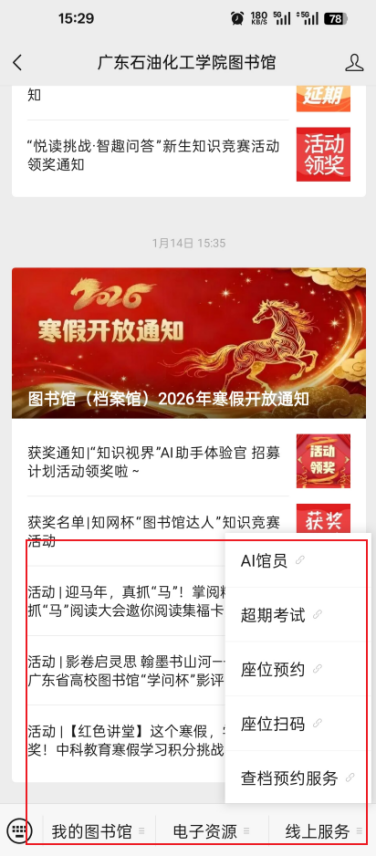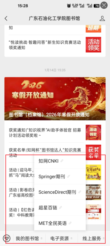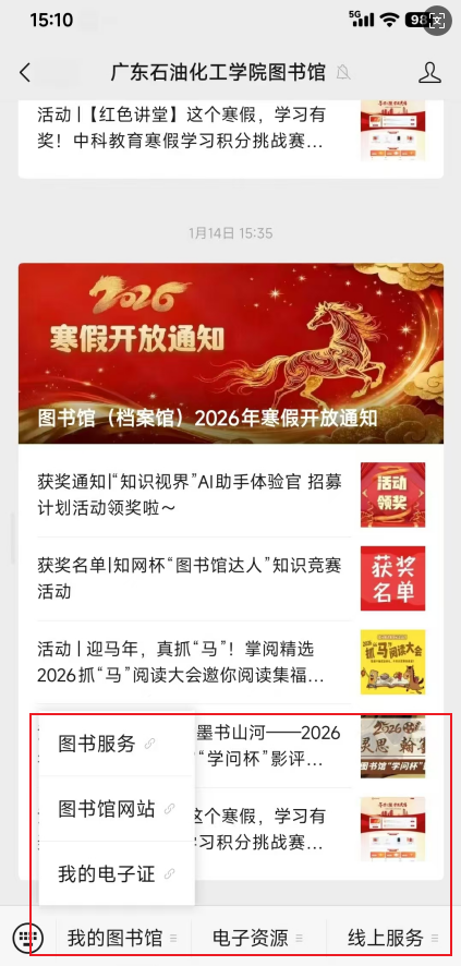 1.因公众号菜单数量有限,未在菜单配置的资源和服务请在“我的图书馆-图书馆网站”菜单打开图书馆网站进行访问。
