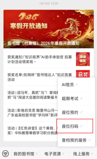 2.使用座位预约系统时,座位预约系统内部的扫码是无法使用的,当需要座位扫码时,需要直接使用公众号菜单下的扫码功能,对应菜单是“线上服务-座位扫码”。